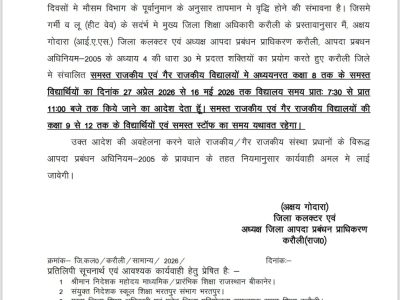 सीकर जिले में बढ़ती हीटवेव और भीषण गर्मी को देखते हुए प्रशासन ने बड़ा फैसला लिया है।कक्षा प्री-प्राइमरी से 8वीं…